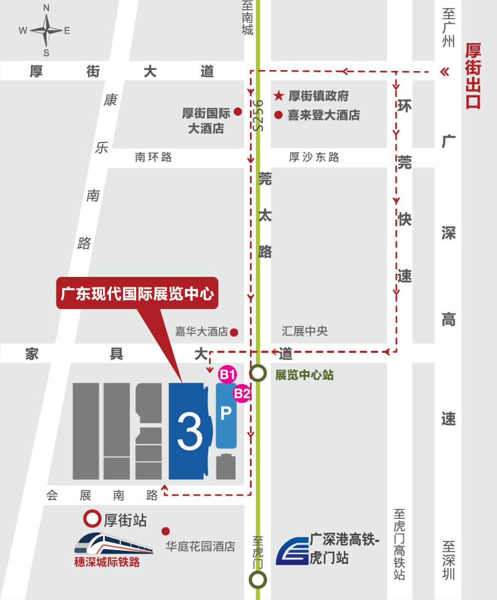 - 广深高速厚街出口→厚街大道→S256省道→展览中心(约20分钟车程)