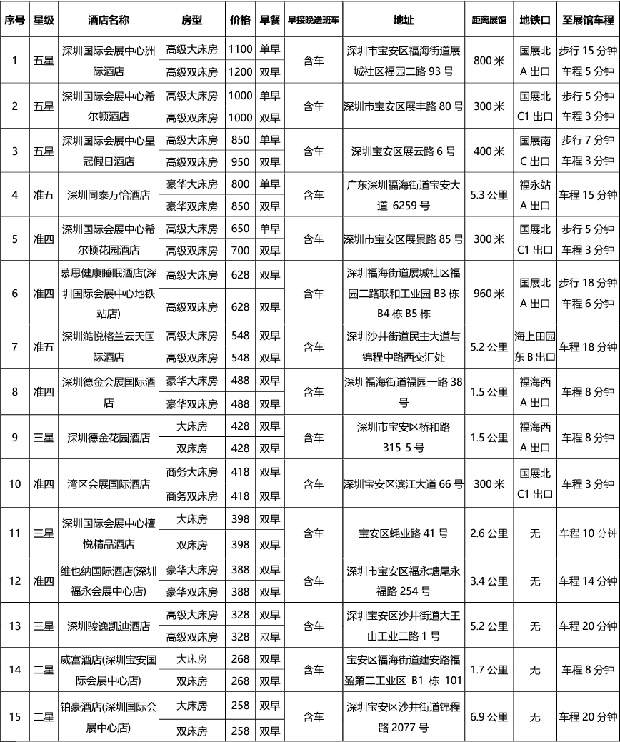 | 酒店至展馆 免费接驳巴士,仅限在深圳市捷旅国际会议展览公司预定酒店方可享受, 其他渠道或平台预定酒店乘车均自理 |