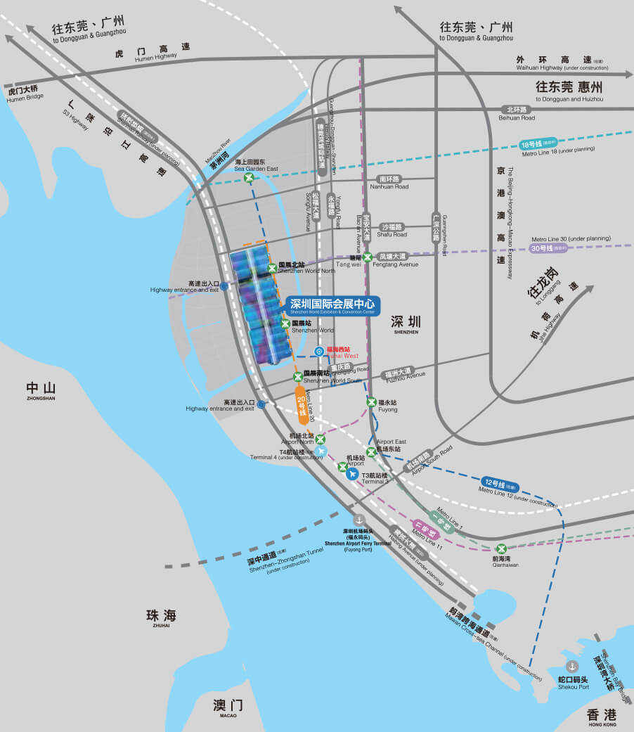 | 深圳国际会展中心位于深圳市宝安区展城路1号,紧邻深圳机场,地处粤港澳大湾区湾顶、珠三角中心和广东自贸区中心,广深港核心发展走廊和东西向发展走廊的交会处,广佛肇、深莞惠和珠中江三大城市圈交会处,地铁12,20号线、穗深城际铁路直达,区位优势突出,具有良好的资源集聚效应和庞大的发展潜力。 |