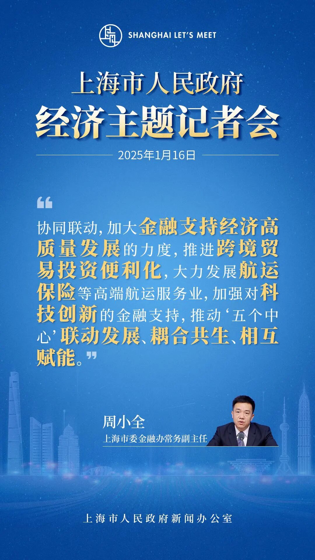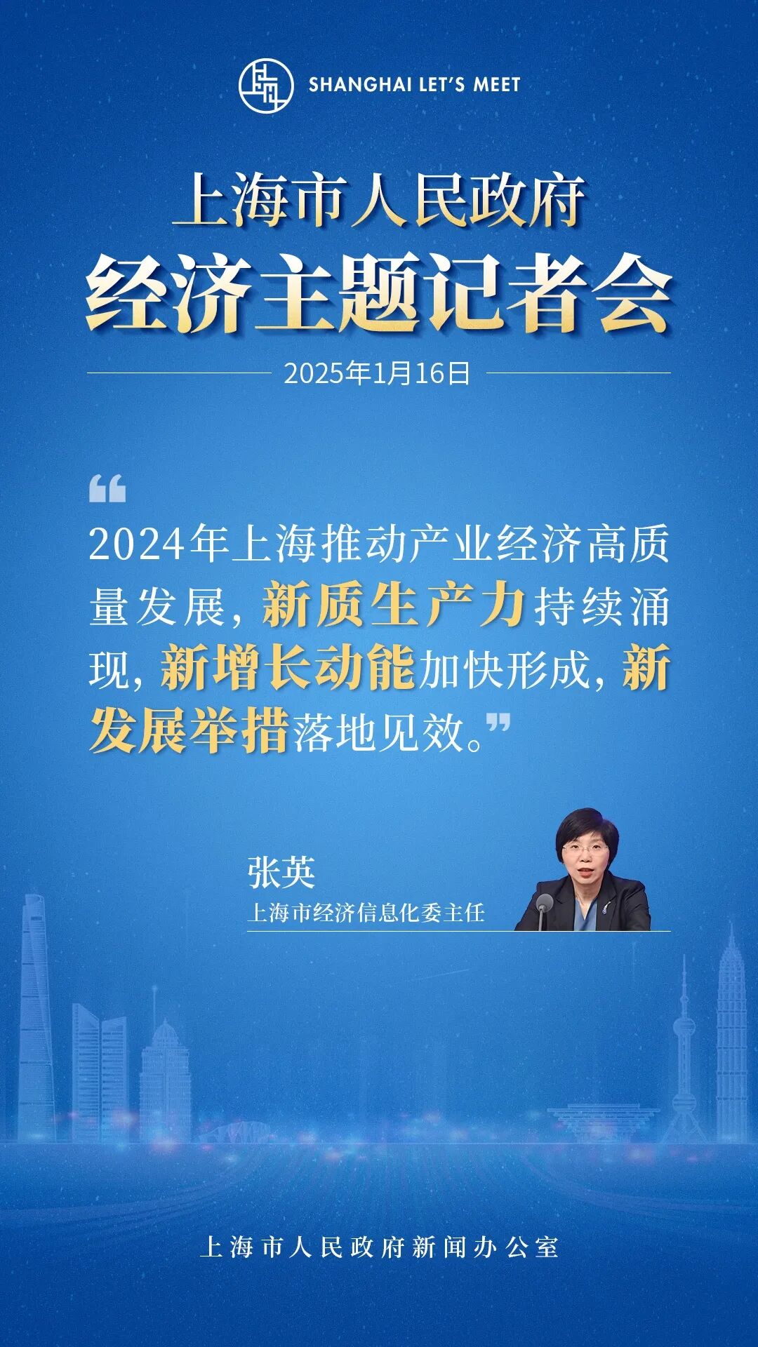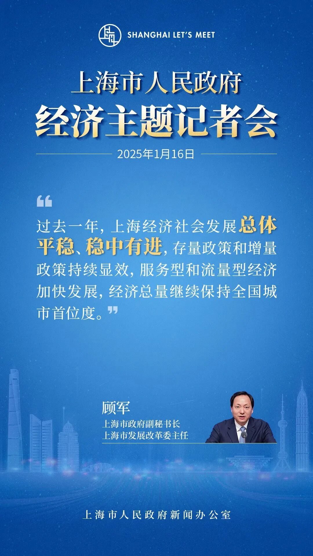 1月16日下午,上海市人民政府新闻办公室举行市政府经济主题记者会。市政府副秘书长、市发展改革委主任顾军,市委金融办常务副主任周小全,市经济信息化委主任张英,市商务委主任朱民,市科委主任骆大进,市交通委主任于福林出席记者会,介绍上海市经济发展有关情况,并回答记者提问。记者会由市政府新闻办主任、市政府新闻发言人陈怡群主持。过去一年,上海深入贯彻落实习近平总书记考察上海重要讲话精神,在党中央、国务院坚强领导下,牢牢把握推动高质量发展首要任务和构建新发展格局战略任务,经济社会发展总体平稳、稳中有进,“五个中心”建设加快推进,城市能级和核心竞争力进一步提升。经济社会发展取得的成绩,可以用4个关键词来概括,分别是“好”、“升”、“快”、“进”。好,就是经济持续回升向好。主要表现为经济运行态势向好。完善经济运行调度机制,存量政策和增量政策持续显效,服务型和流量型经济加快发展。预计2024年全市生产总值超过5万亿元,比上年增长5%左右。就业物价保持稳定,预计城镇调查失业率平均值为4.2%左右,居民消费价格与上年持平。质量效益稳中向好。财政收入在减税降费中保持增长,全年地方一般公共预算收入增长0.7%;居民人均可支配收入增长4.1%左右;规上服务业企业营业收入、利润总额实现两位数增长。内外需求回稳向好。“两重”“两新”工作加力推进,预计全社会固定资产投资总额增长5%左右。商旅文体展联动促消费,首艘国产大型邮轮“爱达·魔都号”开启商业运营,全年入境游客达到670万人次。外贸出口实现韧性增长,规模再创历史新高;实际使用外资175亿美元左右,占全国15%以上。市场预期信心向好。去年12月非制造业商务活动指数达到56.2,保持在荣枯线以上且高于全国水平。升,就是城市核心功能巩固提升。2023年底,习近平总书记考察上海时强调,要以加快建设“五个中心”为主攻方向,统筹牵引经济社会发展各方面工作。一年来,上海加快落实中央支持“五个中心”建设的意见,推动“五个中心”功能融合升级。国际经济中心综合实力持续增强,经济总量继续保持全国城市首位度,现代化产业体系加快构建,国际影响力和辐射带动能力不断增强。国际金融中心服务能级持续提升,2024年上海金融市场交易总额达3650万亿元,持牌金融机构增加到1782家,上海国际再保险登记交易中心成立,上海期货交易所铅、镍、锡和氧化铝期权实现上市。国际贸易中心持续提质升级,全年口岸进出口总额超过11万亿元,继续保持全球城市首位,东方枢纽国际商务合作区总体方案获批实施,离岸贸易、跨境电商等新型国际贸易蓬勃发展。国际航运中心资源配置能力持续增强,全年上海港集装箱吞吐量达5150万标准箱,连续15年保持世界第一,成为全球首个年吞吐量超5000万标准箱的世界大港,航运贸易数字化平台上线运行,全国首例涉外海事临时仲裁在沪裁决。国际科技创新中心策源功能持续强化,预计全年全社会研发经费投入强度为4.4%左右,每万人口高价值发明专利拥有量达到57.9件,技术合同成交额达到5200亿元,在沪国家实验室及基地高质量运行,机器人精准控制等一批关键核心技术取得突破。快,就是新质生产力培育发展加快。主要表现为新旧动能加快转换。全力落实三大先导产业“上海方案”,总规模1000亿元的三大先导产业母基金和未来产业基金启动运行,预计2024年三大先导产业工业产值增长11.9%。实施新型工业化“五大行动”,工业战略性新兴产业总产值占规上工业比重达到44%左右,高端装备、船舶、大飞机等先进制造业增长较快。促进专业服务业高质量发展,信息服务、科技服务、商务服务等行业营收保持较快增长。战略前沿领域加快布局。实施计算生物学、合成生物学、区块链等领域三年行动方案,新型研发机构和高质量孵化器加快发展。高能级主体加快集聚。新增跨国公司地区总部60家、外资研发中心30家,累计分别达到1016家和591家;新认定创新型企业总部49家;高新技术企业突破2.5万家。进,就是高水平改革开放深入推进。主要表现为浦东引领区加快打造。浦东综合改革试点任务有序推进,首单海关特殊监管区邮轮直供物资新模式顺利实施,上海临床创新转化研究院等重大平台挂牌成立。自贸试验区及临港新片区加快建设。高水平制度型开放总体方案“80条”基本完成,离岸贸易印花税免征等政策落地实施,互联网数据中心等增值电信业务扩大开放试点正式启动。临港新片区新一轮市级支持政策出台实施,全国首批数据跨境流动操作指引清单发布。长三角一体化发展扎实推进。编制实施第三轮三年行动计划。长三角生态绿色一体化发展示范区新推出18项制度创新成果,沪苏湖高铁开通运营,华为青浦研发中心正式投用。虹桥国际开放枢纽加快建设,第七届进博会圆满成功举办,按一年计意向成交金额800.1亿美元。营商环境持续优化。优化营商环境7.0版150项改革举措全面完成,重点企业“服务包”制度提质增效,全年为经营主体减负超过1160亿元,市场活力持续激发。2025年是“十四五”规划收官之年。上海将坚持以习近平新时代中国特色社会主义思想为指导,聚焦建设“五个中心”重要使命,干字当头、奋力一跳,进一步全面深化改革,扩大高水平对外开放,扩大内需,稳定预期,激发活力,推动经济持续回