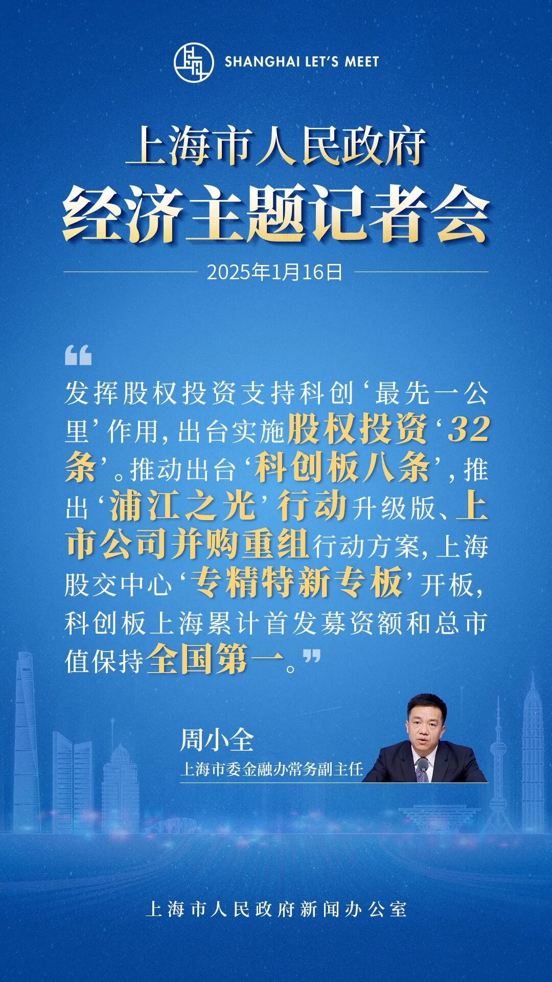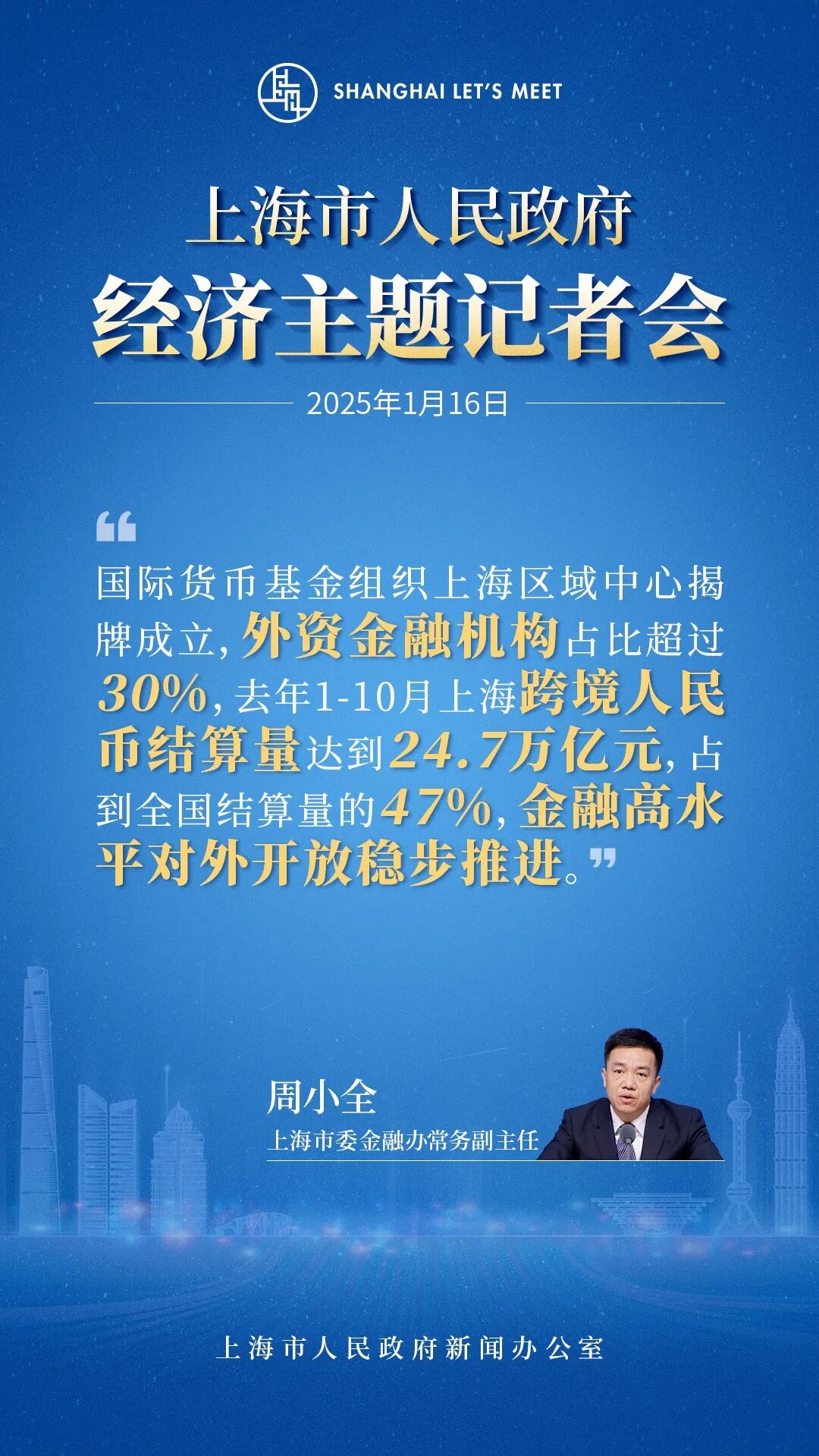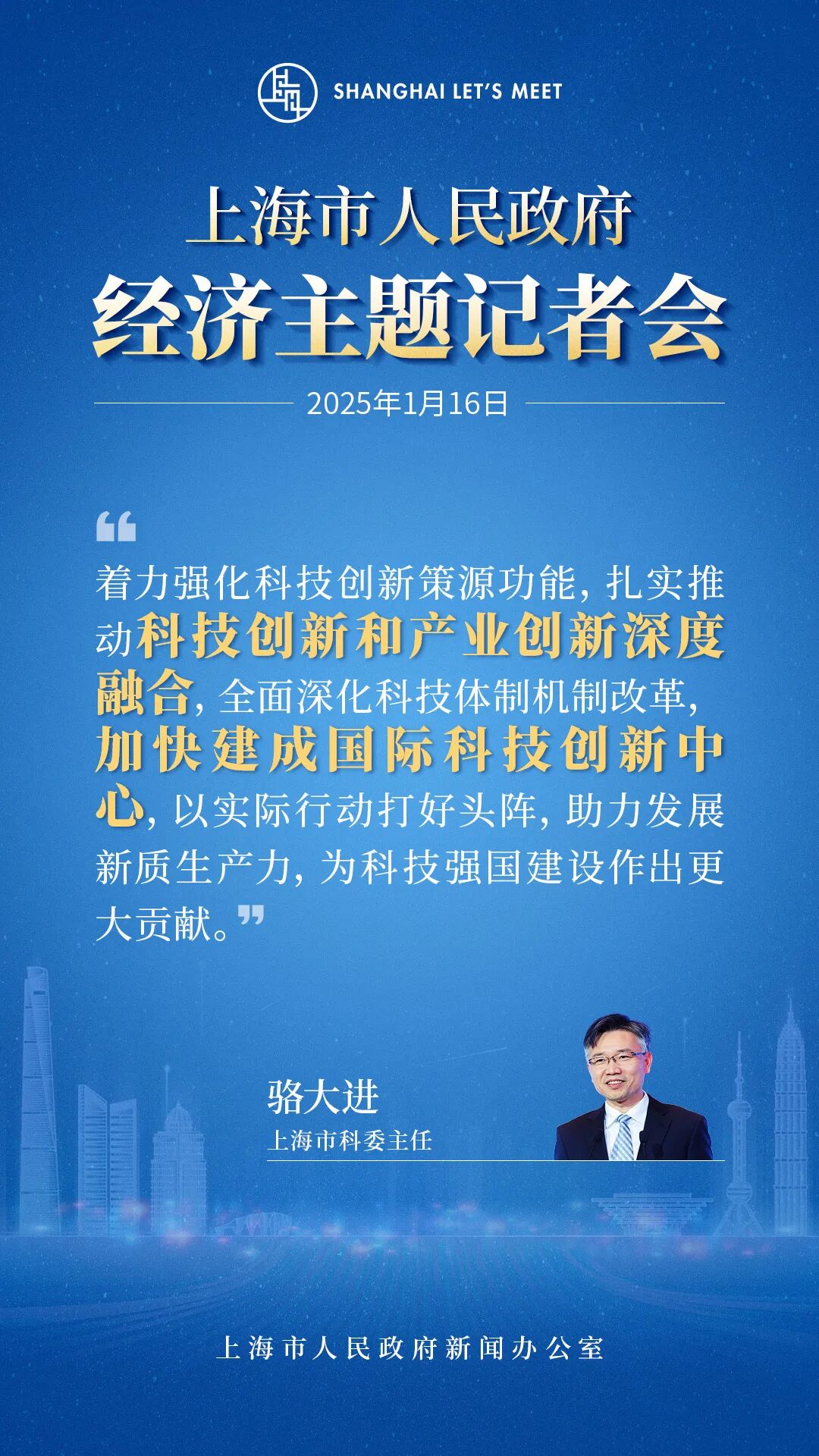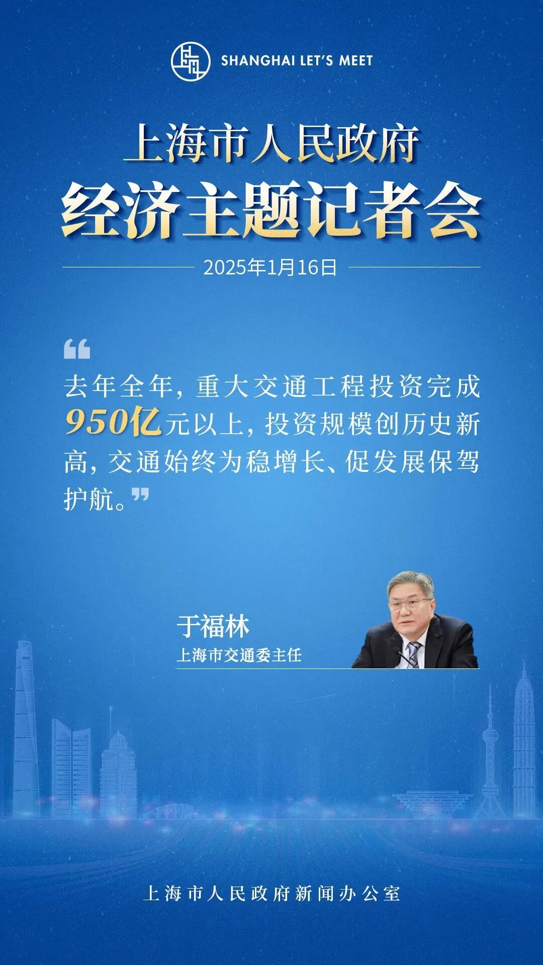 1月16日下午,上海市人民政府新闻办公室举行市政府经济主题记者会。市政府副秘书长、市发展改革委主任顾军,市委金融办常务副主任周小全,市经济信息化委主任张英,市商务委主任朱民,市科委主任骆大进,市交通委主任于福林出席记者会,介绍上海市经济发展有关情况,并回答记者提问。记者会由市政府新闻办主任、市政府新闻发言人陈怡群主持。过去一年,上海深入贯彻落实习近平总书记考察上海重要讲话精神,在党中央、国务院坚强领导下,牢牢把握推动高质量发展首要任务和构建新发展格局战略任务,经济社会发展总体平稳、稳中有进,“五个中心”建设加快推进,城市能级和核心竞争力进一步提升。经济社会发展取得的成绩,可以用4个关键词来概括,分别是“好”、“升”、“快”、“进”。好,就是经济持续回升向好。主要表现为经济运行态势向好。完善经济运行调度机制,存量政策和增量政策持续显效,服务型和流量型经济加快发展。预计2024年全市生产总值超过5万亿元,比上年增长5%左右。就业物价保持稳定,预计城镇调查失业率平均值为4.2%左右,居民消费价格与上年持平。质量效益稳中向好。财政收入在减税降费中保持增长,全年地方一般公共预算收入增长0.7%;居民人均可支配收入增长4.1%左右;规上服务业企业营业收入、利润总额实现两位数增长。内外需求回稳向好。“两重”“两新”工作加力推进,预计全社会固定资产投资总额增长5%左右。商旅文体展联动促消费,首艘国产大型邮轮“爱达·魔都号”开启商业运营,全年入境游客达到670万人次。外贸出口实现韧性增长,规模再创历史新高;实际使用外资175亿美元左右,占全国15%以上。市场预期信心向好。去年12月非制造业商务活动指数达到56.2,保持在荣枯线以上且高于全国水平。升,就是城市核心功能巩固提升。2023年底,习近平总书记考察上海时强调,要以加快建设“五个中心”为主攻方向,统筹牵引经济社会发展各方面工作。一年来,上海加快落实中央支持“五个中心”建设的意见,推动“五个中心”功能融合升级。国际经济中心综合实力持续增强,经济总量继续保持全国城市首位度,现代化产业体系加快构建,国际影响力和辐射带动能力不断增强。国际金融中心服务能级持续提升,2024年上海金融市场交易总额达3650万亿元,持牌金融机构增加到1782家,上海国际再保险登记交易中心成立,上海期货交易所铅、镍、锡和氧化铝期权实现上市。国际贸易中心持续提质升级,全年口岸进出口总额超过11万亿元,继续保持全球城市首位,东方枢纽国际商务合作区总体方案获批实施,离岸贸易、跨境电商等新型国际贸易蓬勃发展。国际航运中心资源配置能力持续增强,全年上海港集装箱吞吐量达5150万标准箱,连续15年保持世界第一,成为全球首个年吞吐量超5000万标准箱的世界大港,航运贸易数字化平台上线运行,全国首例涉外海事临时仲裁在沪裁决。国际科技创新中心策源功能持续强化,预计全年全社会研发经费投入强度为4.4%左右,每万人口高价值发明专利拥有量达到57.9件,技术合同成交额达到5200亿元,在沪国家实验室及基地高质量运行,机器人精准控制等一批关键核心技术取得突破。快,就是新质生产力培育发展加快。主要表现为新旧动能加快转换。全力落实三大先导产业“上海方案”,总规模1000亿元的三大先导产业母基金和未来产业基金启动运行,预计2024年三大先导产业工业产值增长11.9%。实施新型工业化“五大行动”,工业战略性新兴产业总产值占规上工业比重达到44%左右,高端装备、船舶、大飞机等先进制造业增长较快。促进专业服务业高质量发展,信息服务、科技服务、商务服务等行业营收保持较快增长。战略前沿领域加快布局。实施计算生物学、合成生物学、区块链等领域三年行动方案,新型研发机构和高质量孵化器加快发展。高能级主体加快集聚。新增跨国公司地区总部60家、外资研发中心30家,累计分别达到1016家和591家;新认定创新型企业总部49家;高新技术企业突破2.5万家。进,就是高水平改革开放深入推进。主要表现为浦东引领区加快打造。浦东综合改革试点任务有序推进,首单海关特殊监管区邮轮直供物资新模式顺利实施,上海临床创新转化研究院等重大平台挂牌成立。自贸试验区及临港新片区加快建设。高水平制度型开放总体方案“80条”基本完成,离岸贸易印花税免征等政策落地实施,互联网数据中心等增值电信业务扩大开放试点正式启动。临港新片区新一轮市级支持政策出台实施,全国首批数据跨境流动操作指引清单发布。长三角一体化发展扎实推进。编制实施第三轮三年行动计划。长三角生态绿色一体化发展示范区新推出18项制度创新成果,沪苏湖高铁开通运营,华为青浦研发中心正式投用。虹桥国际开放枢纽加快建设,第七届进博会圆满成功举办,按一年计意向成交金额800.1亿美元。营商环境持续优化。优化营商环境7.0版150项改革举措全面完成,重点企业“服务包”制度提质增效,全年为经营主体减负超过1160亿元,市场活力持续激发。2025年是“十四五”规划收官之年。上海将坚持以习近平新时代中国特色社会主义思想为指导,聚焦建设“五个中心”重要使命,干字当头、奋力一跳,进一步全面深化改革,扩大高水平对外开放,扩大内需,稳定预期,激发活力,推动经济持续回