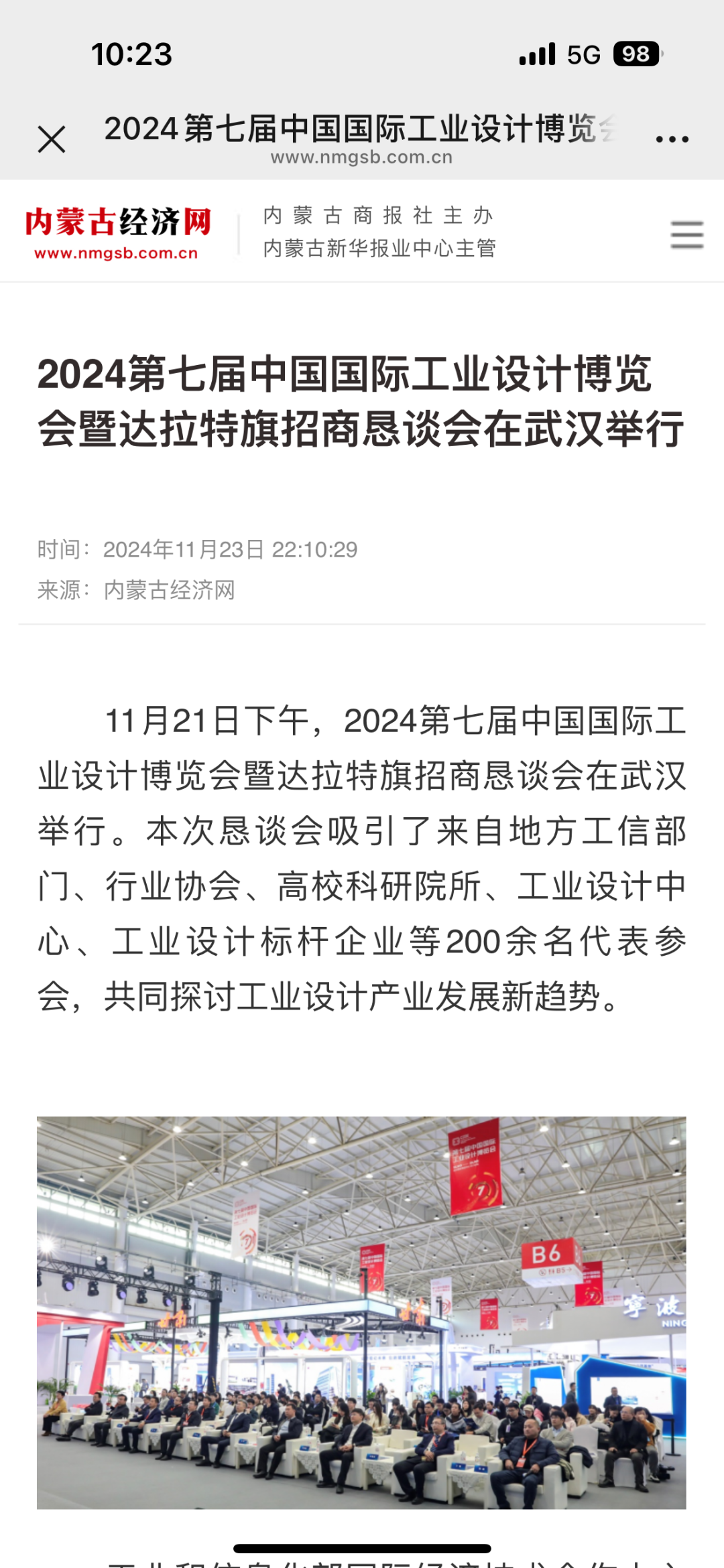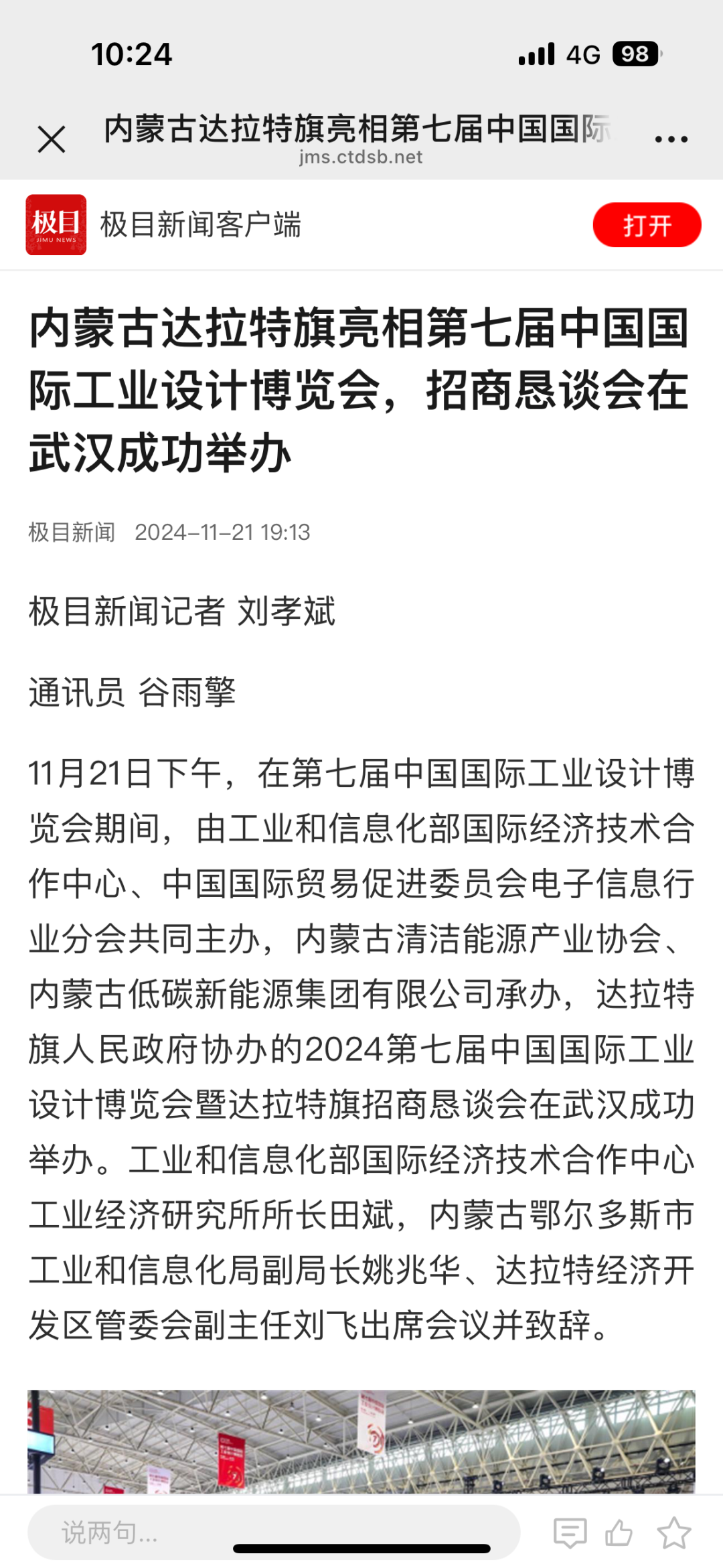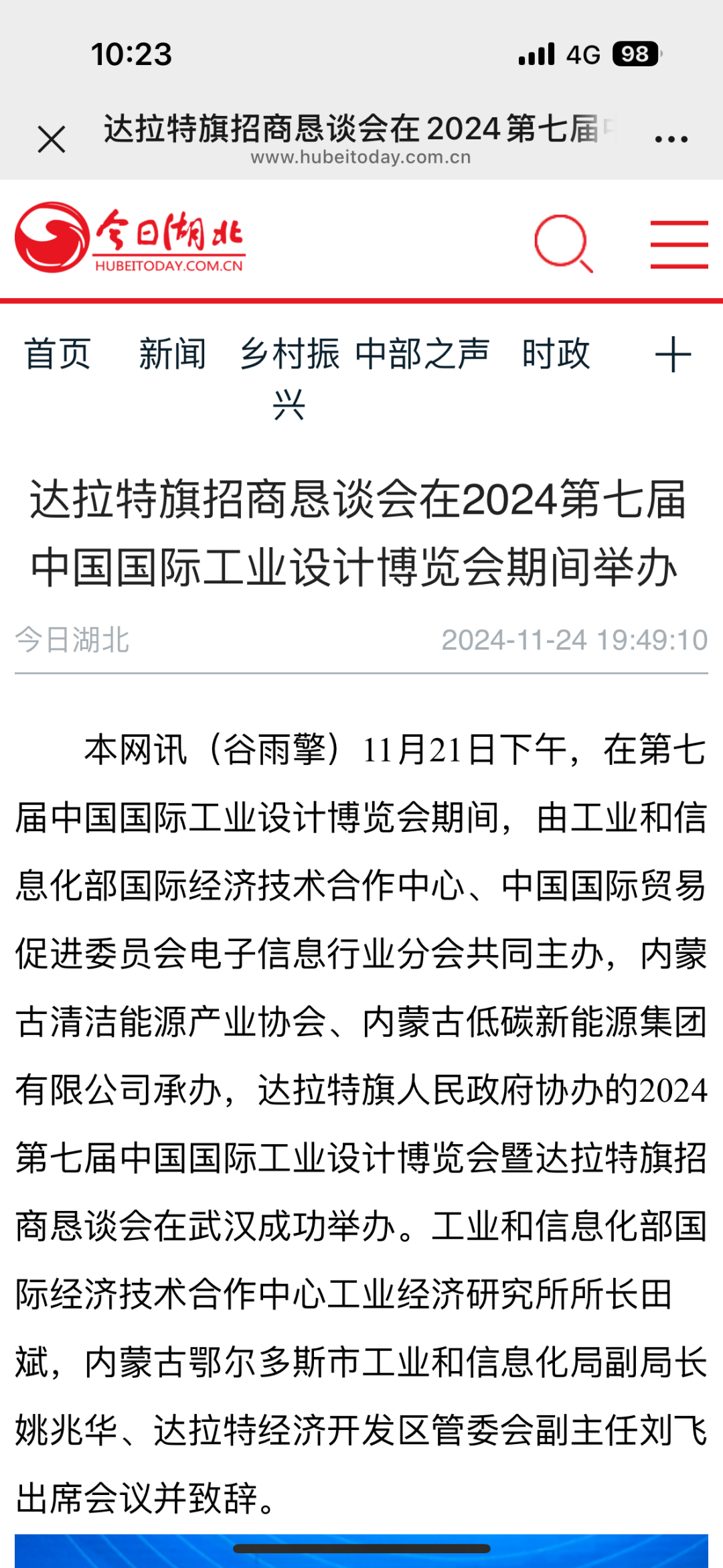 11月21日下午,在第七届中国国际工业设计博览会期间,由工业和信息化部国际经济技术合作中心、中国国际贸易促进委员会电子信息行业分会共同主办,内蒙古清洁能源产业协会、内蒙古低碳新能源集团有限公司承办,达拉特旗人民政府协办的2024第七届中国国际工业设计博览会暨达拉特旗招商恳谈会在武汉成功举办。各大媒体争相报道。央视新闻联播湖北综合新华网中国新闻网经济杂志内蒙古经济网北方经济网草原云今日湖北今日头条网易搜狐极目