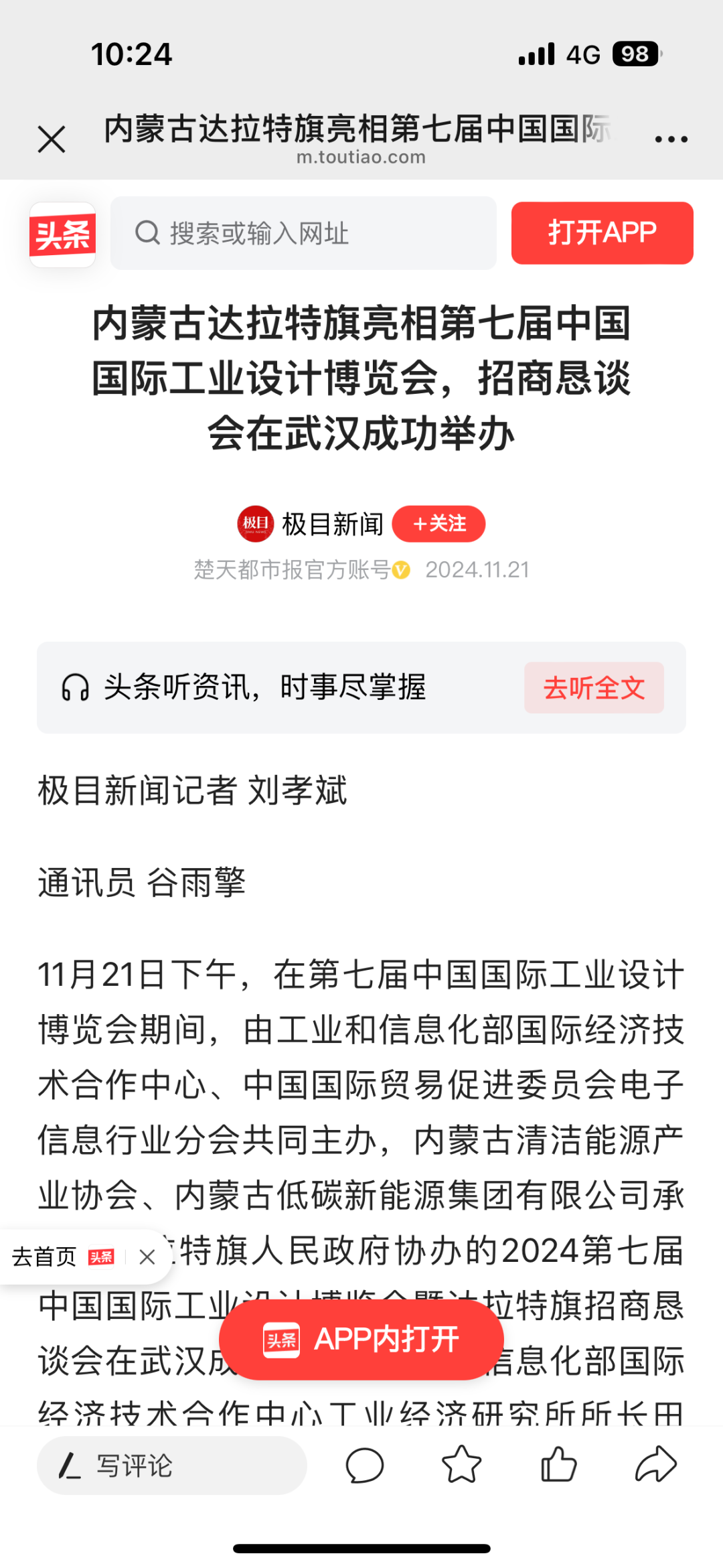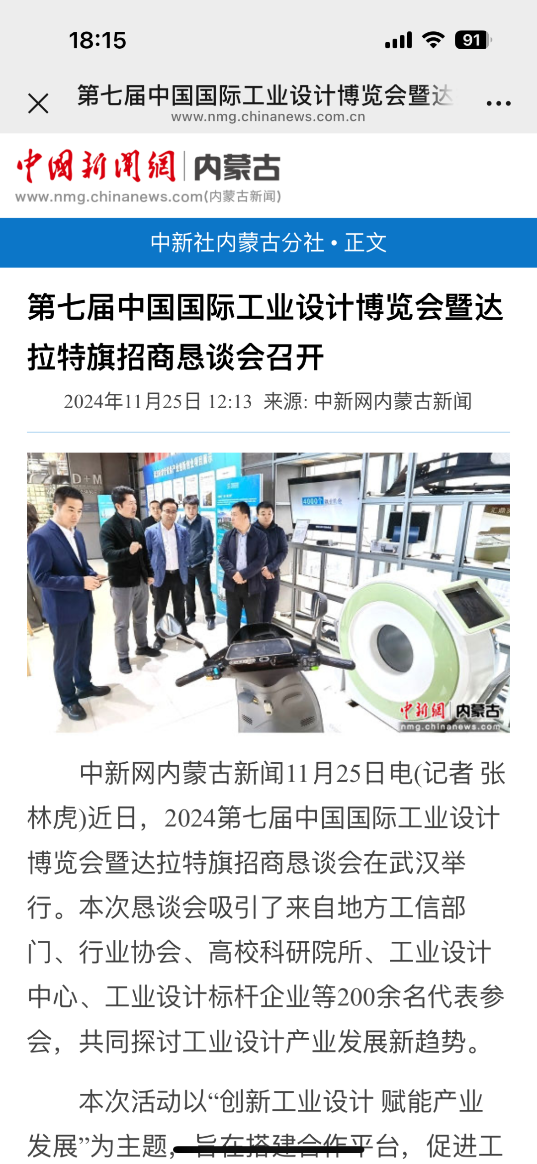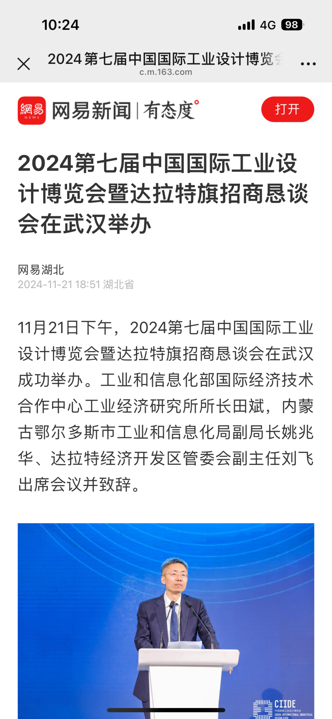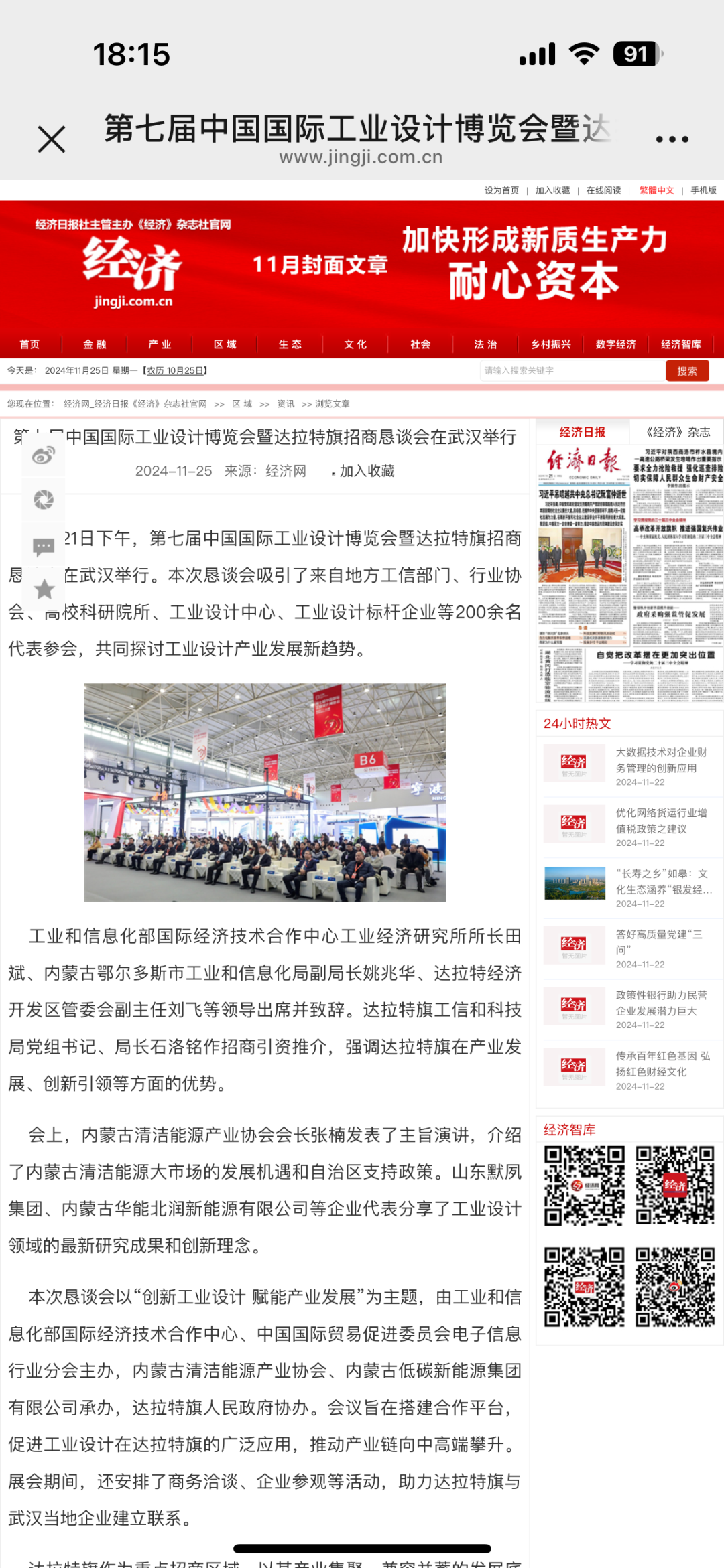 11月21日下午,在第七届中国国际工业设计博览会期间,由工业和信息化部国际经济技术合作中心、中国国际贸易促进委员会电子信息行业分会共同主办,内蒙古清洁能源产业协会、内蒙古低碳新能源集团有限公司承办,达拉特旗人民政府协办的2024第七届中国国际工业设计博览会暨达拉特旗招商恳谈会在武汉成功举办。各大媒体争相报道。央视新闻联播湖北综合新华网中国新闻网经济杂志内蒙古经济网北方经济网草原云今日湖北今日头条网易搜狐极目