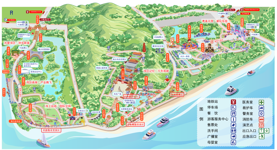 游览路线:1号大门—鼎盛中华—云山珠水—湾区同心—盛世同心—魅力全运会—丝路长安集市—商业古街—主舞台—大吉大利—簪花女神—五路财神—南沙印象—萌蛇报春—真心话大冒险—齐天大圣—赛博海洋—赛博醒狮—出口