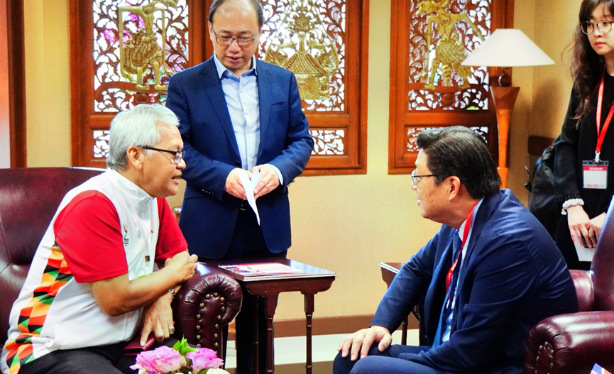 中国体育用品业联合会副主席兼秘书长罗杰与印度尼西亚国家体育委员会商务副主席Bambang gudadi sasongko在2024中国体博会(印尼)-东盟展期间实现会面