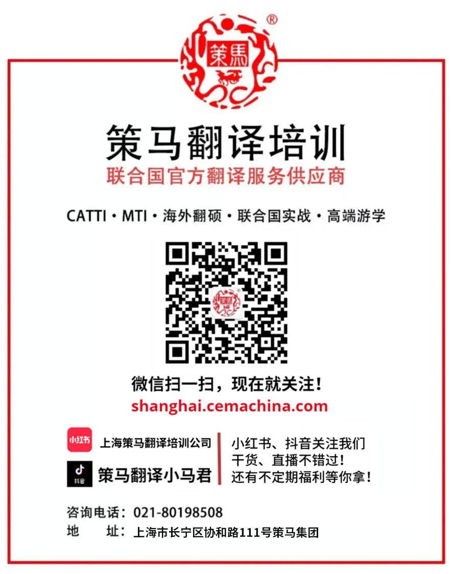 策马集团作为联合国官方翻译服务供应商(ID:496547)、联合国全球契约组织成员(ID:109301),旗下著名翻译培训品牌——“策马翻译培训”始终秉承世界级办学标准,以培养一流翻译人才为目标,为莘莘学子积极打造在联合国等国际组织平台进行高端口笔译实训的宝贵契机。