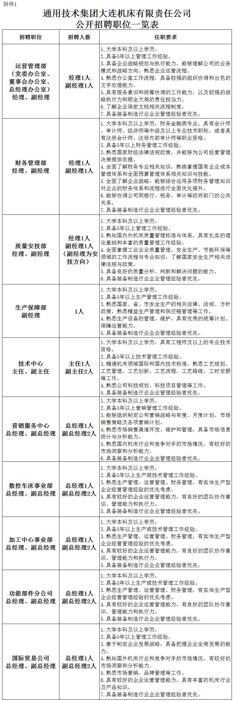 通用技术集团大连机床有限责任公司(以下简称“大连机床”)成立于2019年4月,前身于1935年建厂,是新中国机床工具行业的十八罗汉骨干企业之一。八十多年来,大连机床在汽车、轨道交通、工程机械、石油机械、矿山冶金、通讯器材、职业教育等行业领域为全球100多个国家和地区提供优质产品服务和综合解决方案。创造了新中国第一台车床、铲齿车床、多刀车床、组合机床等数十个全国第一,曾荣获中国制造业500强、中国机械工业百强、中国工业大奖表彰奖、国家技术创新示范企业、装备中国功勋企业等荣誉称号,曾在世界机床行业排名前10位。按照中国通用技术(集团)控股有限责任公司(以下简称“通用技术集团”)和通用技术集团机床有限公司对深化改革、推进企业高质量发展的工作要求,大连机床根据工作需要,将组织开展中层干部公开招聘工作。有关事宜公告如下:本次公开招聘中层正职职位9个、副职职位16个。招聘职位及职数具体如下:运营管理部(党委办公室、董事会办公室、总经理办公室):1.坚决贯彻落实习近平新时代中国特色社会主义思想,拥护党的理论和路线方针政策,深刻领悟“两个确立”的决定性意义,增强“四个意识”、坚定“四个自信”、做到“两个维护”,严守政治纪律和政治规矩,具有较高的政治素质,在思想上政治上行动上同以习近平同志为核心的党中央保持高度一致。2.具有强烈的纪律意识和职业操守,遵纪守法,严格律己,合规执业,品行端正,廉洁从业,具有高质量发展理念,助推企业高质量发展,拥有振兴中国机床行业的雄心壮志和担当精神。3.具有较强创新意识和改革精神,善于组织、协调、沟通,注重团结协作,能够调动各方面积极性,具有良好的群众基础。4.具有较强的专业素养及专业能力,熟悉专业领域相关的政策理论,精通专业知识,了解前沿动态和发展趋势。(1)一般应当具有满3年以上下一层级工作经历;未满3年的,一般应当具有下一层级及以上至少满1年且和专员级职务累计5年以上工作经历。应聘中层正职干部职务的,一般应当具有中层副职干部职务1年以上工作经历。(2)对于无法对应职级的,应具有大中型企业等单位3年以上中高层管理工作经历。4.应聘正职岗位的应为中国共产党党员,应聘副职岗位的,同等条件下中国共产党党员优先。5.不存在法律、法规、规章制度中有关国有企业领导人员禁止从业的情形,以及违反《国有企业领导人员廉洁从业若干规定》的情形。公开报名→资格审查→面试考察→任前考察→体检(公司外人员)→相关手续办理。(1)应聘者需填写公开招聘报名表(见附件2,附近期二寸彩色照片),打印且亲笔签名,扫描成PDF文件,以电子邮件方式发送至job@dmtg.gt.cn,邮件标题格式为“应聘职位+姓名”。(2)提供资质证明材料扫描件,包括但不限于:身份证、学历证、学位证、专业资格证书、获奖证书。以上报名材料将作为资格审查的主要依据,须详细、如实提供。任何时候一经发现提供虚假信息及材料,立即取消应聘资格。如已聘任后发现提供了虚假信息和材料,立即解除劳动关系并追索已发工资。1.大连机床内部参与竞聘者须应聘两个岗位,并在报名表中按先后顺序填写“应聘职位”,首选职位排在前面。能否成功聘任以及聘任具体职位,由公司确定。2.应聘者要按照规定的内容、时间等有关要求进行报名,对于不符合要求的将取消应聘资格。3.本次聘任干部的聘职试用期原则上为1年。试用期满后,经考核胜任试任职务的,正式任职,其试用期计入聘职时间;不胜任的,免去试任职务。4.面试时间及地点将通过邮件、电话或短信等方式告知,请应聘者提供准确的邮箱地址并及时查收邮件,同时保持电话畅通。5.本公告由大连机床中层干部公开招聘领导小组负责解释。扫一扫文中“二维码” ,下载附件或报名