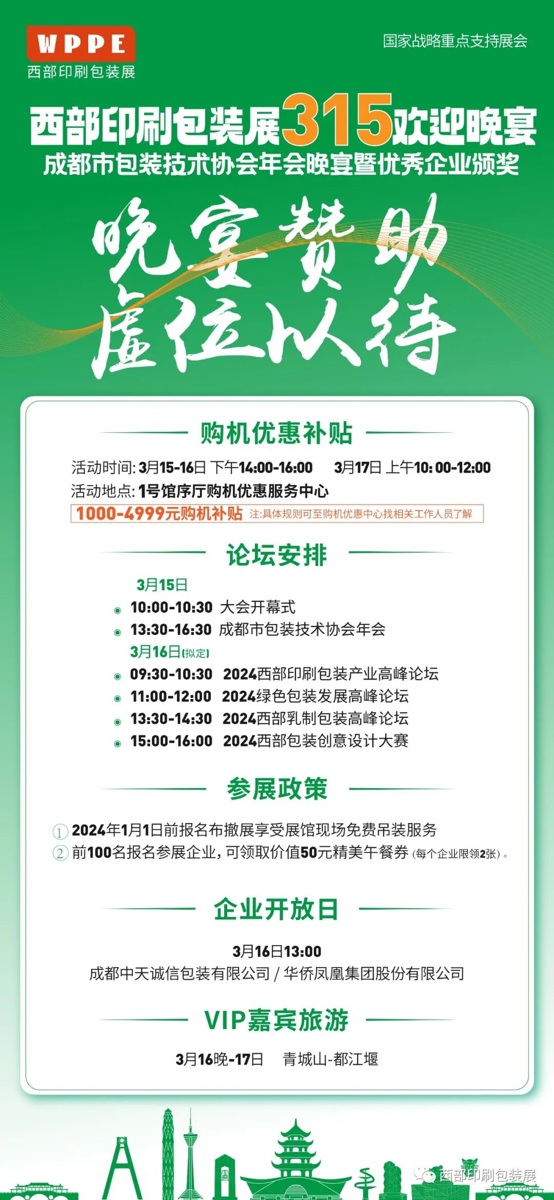 2024中国西部(成都)国际印刷包装全产业博览会将围绕工业 4.0 与打造展示、体验、交流、交易四个平台,集中展示印刷包装行业新材料、新设备、新技术、新工艺、新产品,展会旨在为参展商及印刷包装业人士提供一个更好的展示和交流的平台。本届展会以“印前设备、印后设备、瓦楞纸箱、包装制品、标签印刷、包装容器”六大领域和西部印刷包装文化节专区为特色,必将是一次高层次、大规模、影响深远的盛会。本届展会展览规模预计 30000 平米,展商 500 家左右,专业观众预计30000人次,展览期间还将举办西部包装行业发展大会、主旨论坛产品发布会等活动。