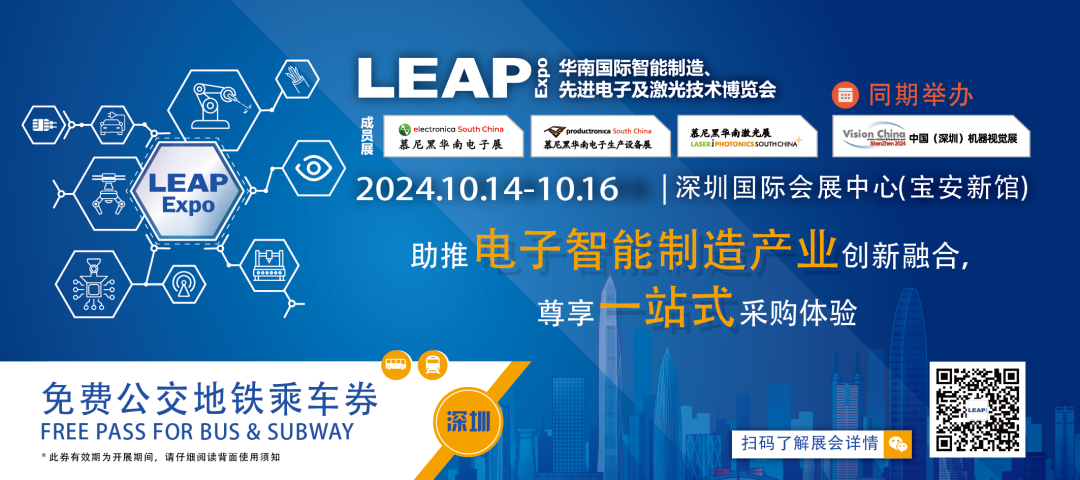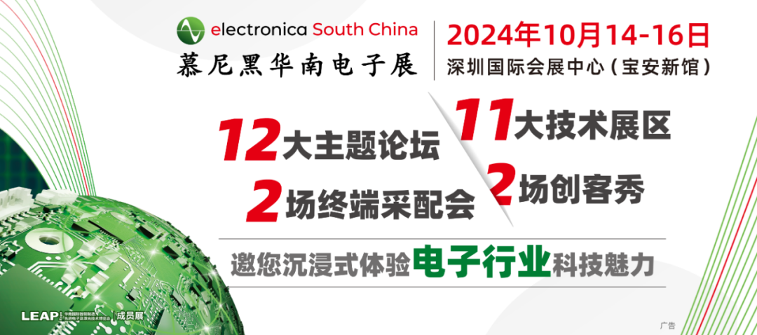 慕尼黑华南电子展(electronica South China)将于这个深秋2024年10月14-16日深圳国际会展中心(宝安新馆)举办。本届展会将聚焦智能电动汽车、汽车半导体芯片、工业及物联网、AI芯片与智能终端、消费电子、蓝牙技术,储能产业链、三代半、集成电路、传感与连接器件、无源器件、电源与测试测量仪器仪表、PCB等热门电子技术与应用,通过主题展馆展区和技术论坛,从前沿技术到实际应用,为产业观众提供电子半导体领域一站式采购服务。