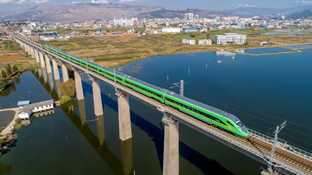 复兴号动车行驶在虎跳峡金沙江铁路大桥上(2023年11月25日摄,无人机照片)。新华社记者 胡超 摄