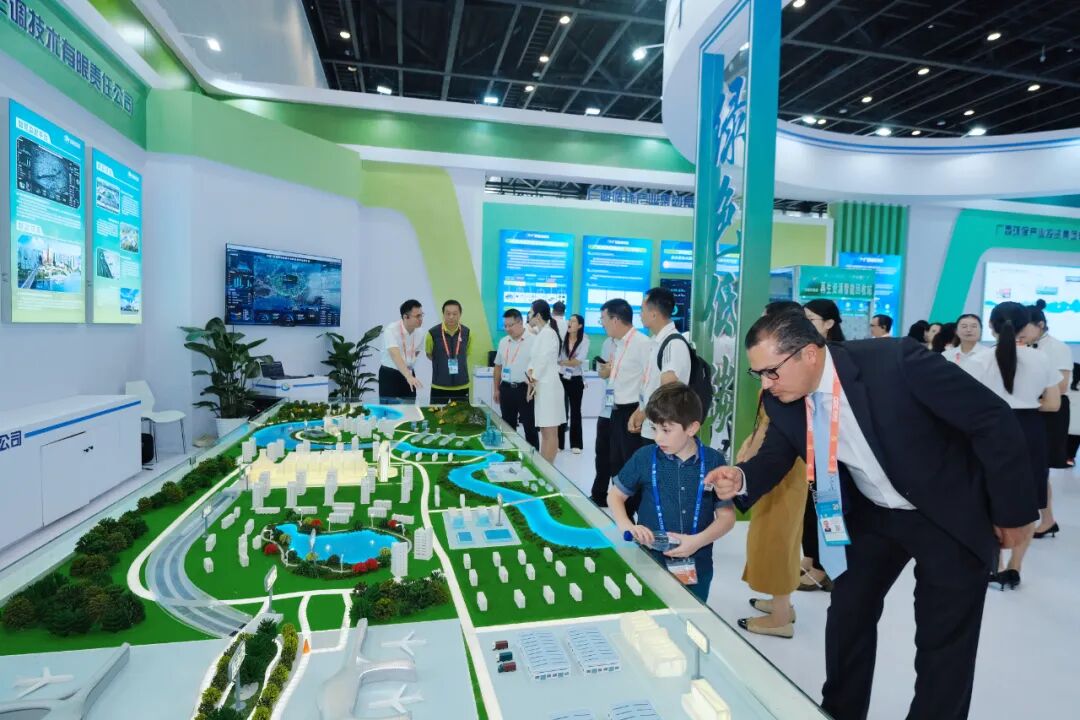 “贵港模式”沙盘是广西环保集团备受瞩目的亮点之一,众多参展观众驻足了解。“项目全部建成达产后,供热能力达450吨/时,利用农林废弃生物质达220万吨/年,减少二氧化碳排放约100万吨/年。2023年,项目还入选了自治区‘碳达峰碳中和典型案例’。”展区的工作人员热情地进行讲解,并为越南、泰国等东盟国家友人介绍生物质能转化为热能并提供企业生产的全过程。