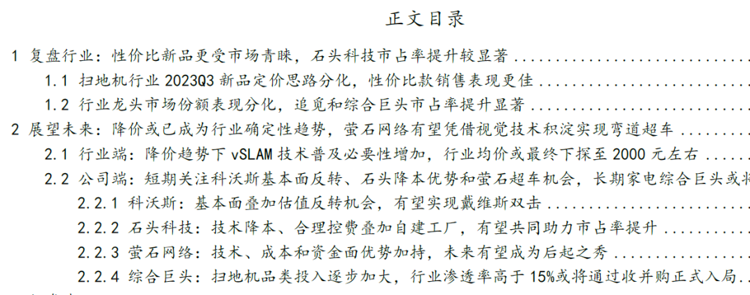 - 2023年盘点:扫地机器人行业预计在2023年将受益于国内消费复苏。更有性价比的基站类扫地机器人的推出,预计将使行业销量重回增长趋势。割草机器人等新兴服务机器人品类在2023年有望迎来放量。- 2024年展望:服务机器人、特种机器人行业应用的深度和广度预计将显著提升。聚焦10大应用重点领域,突破100种以上机器人创新应用技术及解决方案。