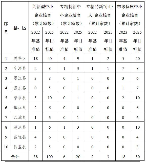 实施企业梯度培育,围绕普洱市9大重点产业,聚焦高新技术企业、科技型中小企业,扩充完善优质企业培育库,加强动态管理,做好跟踪监测,实施精准培育。突出示范引领,评选一批市级优质中小企业,培育一批创新型中小企业和专精特新中小企业,争创一批专精特新“小巨人”企业,推荐申报制造业单项冠军企业。各县(区)人民政府、各有关部门要加强政策支持,靶向培育,精准服务,引导各行业企业向专精特新方向发展,争取更多企业纳入梯度培育范畴,壮大专精特新企业队伍。〔市发展改革委、市工业和信息化局、市科技局、市住房城乡建设局、市农业农村局、市商务局、市文化和旅游局,市投资促进局、云南思茅产业园区管委会、云南景谷产业园区管委会、云南孟连边境经济合作区管委会,各县(区)人民政府按照职责分工负责〕