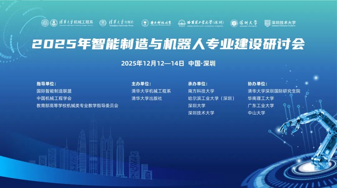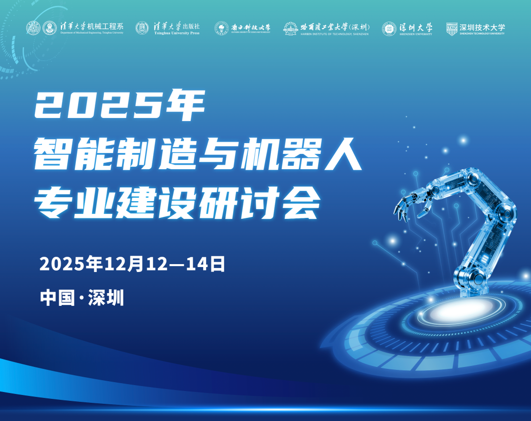 为主动应对全球新一轮的科技革命与产业变革,服务国家制造强国战略,共同探讨面向未来的智能制造与机器人专业建设新路径、新范式,推动跨学科交叉融合,赋能拔尖创新人才培养,由国际智能制造联盟、中国机械工程学会、教育部高等学校机械类专业教学指导委员会指导,清华大学机械工程系、清华大学出版社主办,南方科技大学、哈尔滨工业大学(深圳)、深圳大学、深圳技术大学承办,清华大学深圳国际研究生院、华南理工大学、广东工业大学、中山大学协办的2025年智能制造与机器人专业建设研讨会将于2025年12月12—14日深圳市召开。