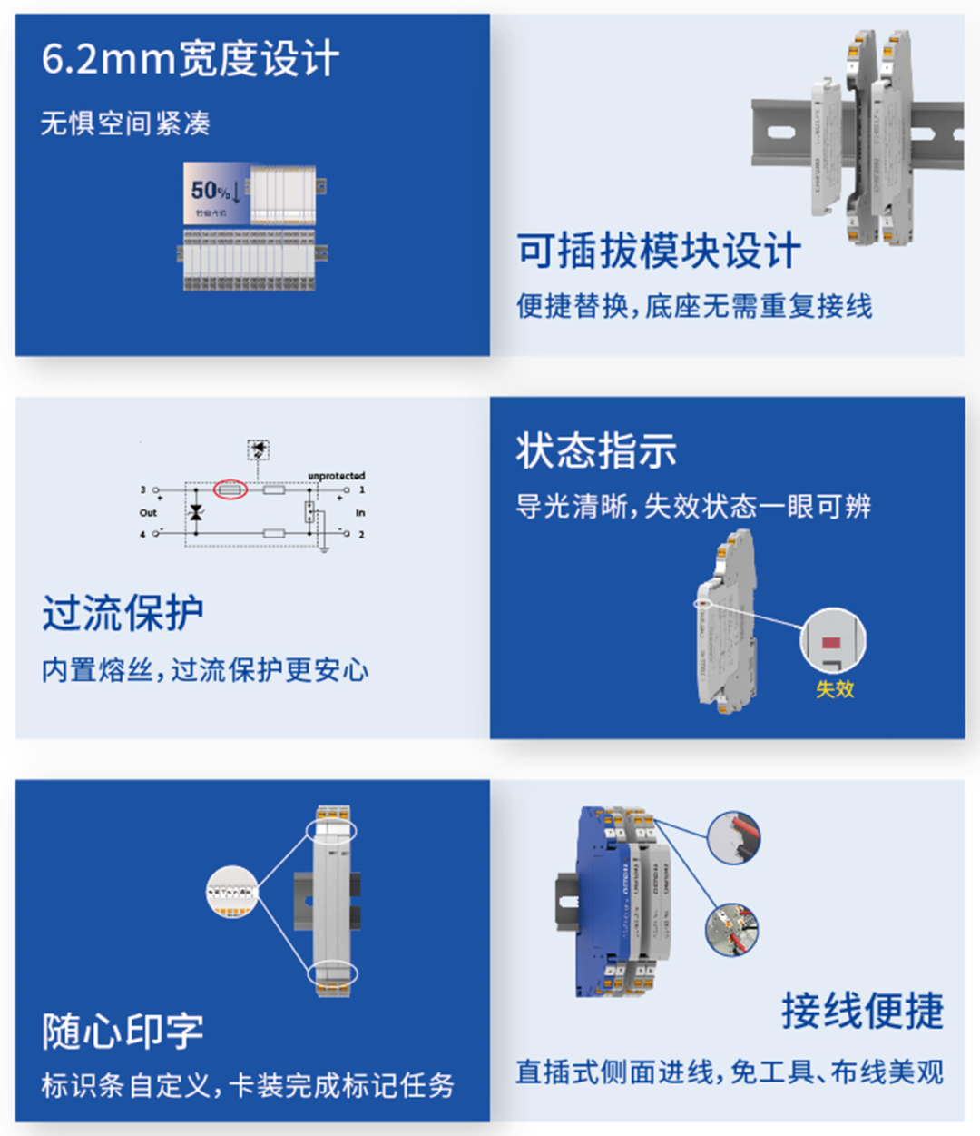 采用薄款6.2mm设计,节省了客户控制柜安装空间,'我'薄了但雷电防护能力未减弱,在雷雨天守护自动化领域信号设备正常运行。