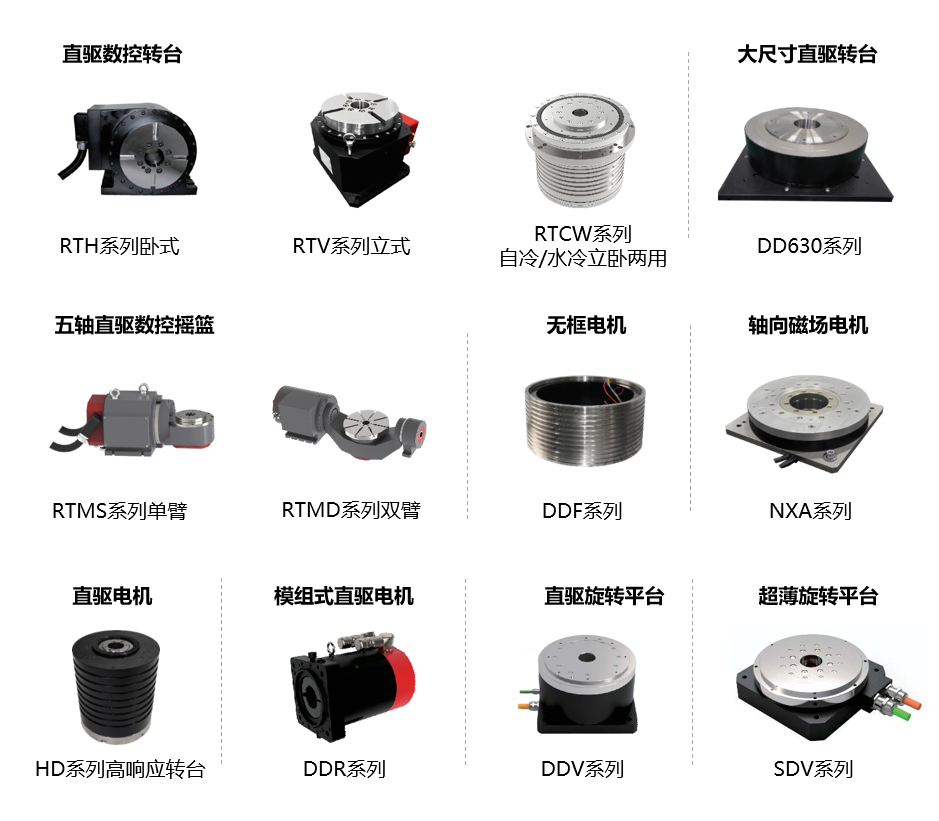 本次展品包括数控五轴摇篮、数控卧式直驱转台、数控立式直驱转台、自冷/水冷立卧两用直驱转台、水冷直线电机、水冷无框电机等等,敬请期待。