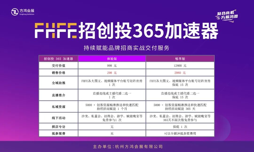 公司定期举办“按效果付费”的FHFE中国连锁联营招商加盟博览会,简称“杭州连锁加盟展”。平台通过收集和展示各种招商加盟项目,帮助投资者找到合适的创业机会,同时也帮助招商者扩大品牌影响力,吸引更多的加盟商和投资创业者。