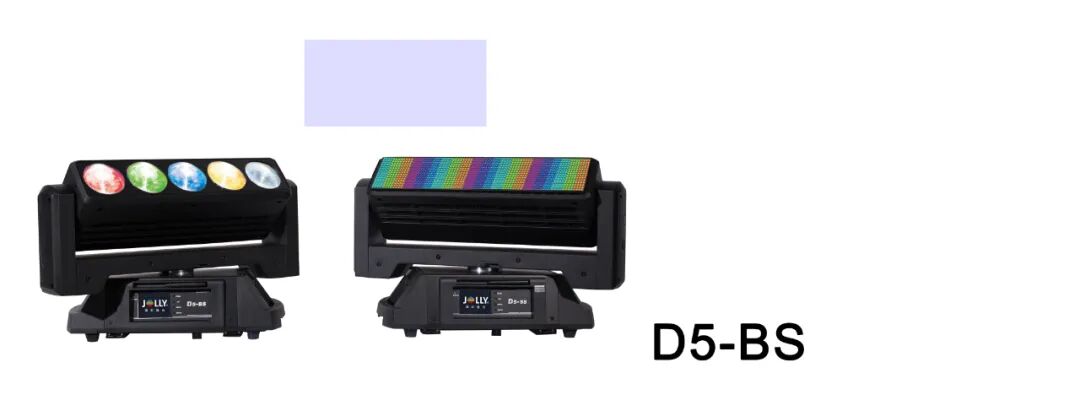 D5-BS :一面是光输出角4°的5颗LED,每颗60W OSRAM RGBW大功率灯珠,每颗都可单控;另一面1280颗LED每颗0.2W RGB,可实现爆闪、像素、视频功能,内置大量的可编辑宏功能,也可接Madrix 第三方软件编辑个性化的图层功能。