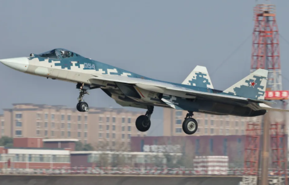 11月3日14时20分许,隐身战机苏-57在太原降落。图源:央视军事