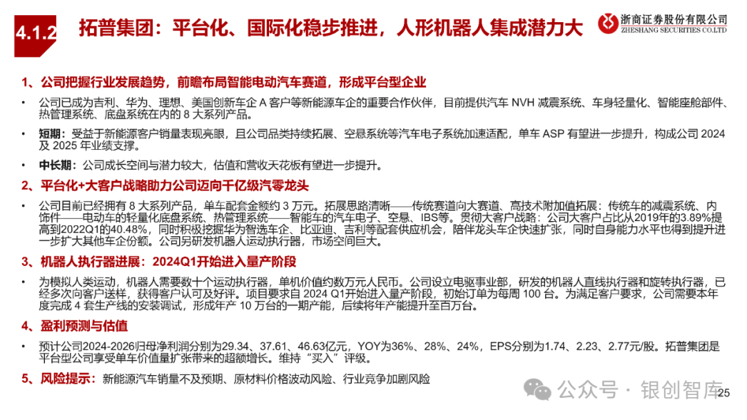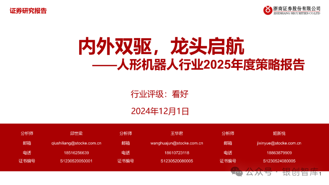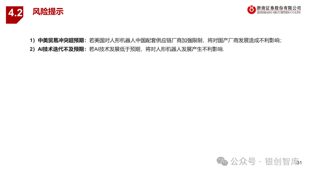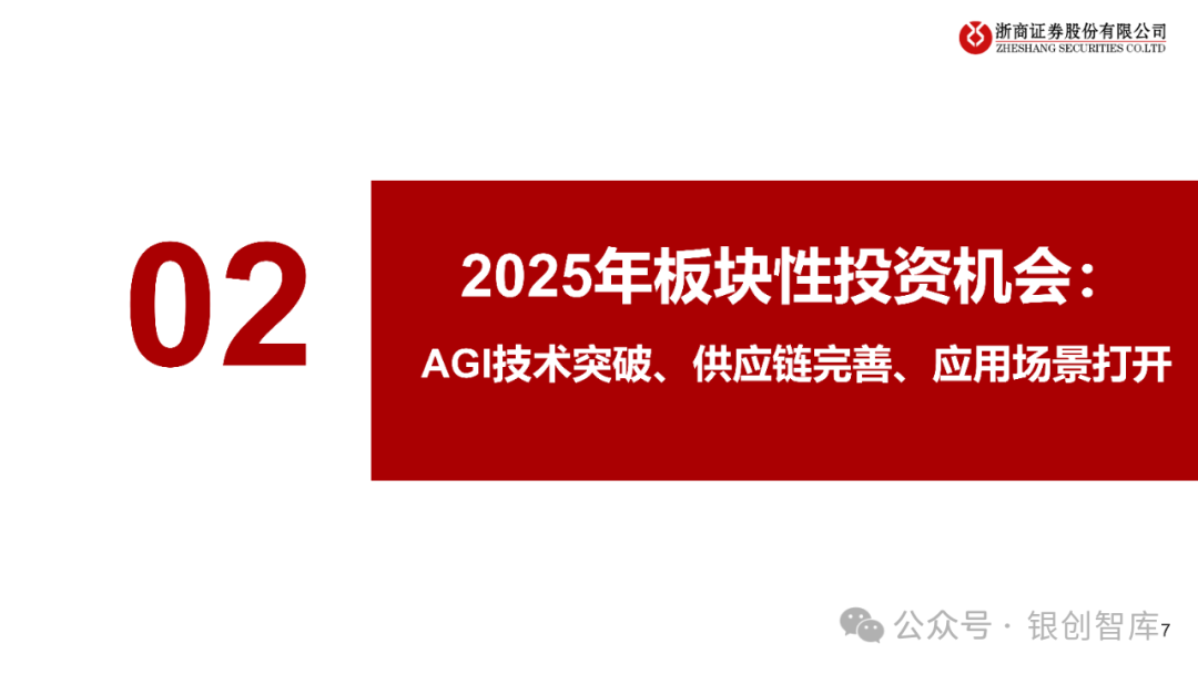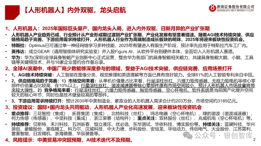 人形机器人产业趋势已成,行业预计从产业形成期过渡到产业扩张期,产业化发展有望显著提速。随着AGI技术持续突破、供应链格局趋于完善、下游应用需求持续打开,人形机器人行业作为高端制造成长板块的明珠,2025年将迎来板块性投资机会。