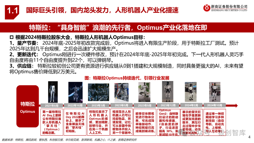 • 特斯拉:Optimus已可通过单一神经网络学习多种技能,2025年有望进入有限生产阶段,预计率先应用于特斯拉汽车工厂内。